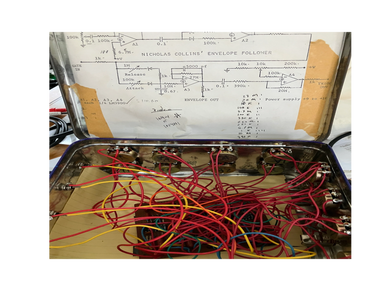Nic Collins' envelope follower: amplitudes of the clarinet, trumpet and cello are used to control parameters of modulation.